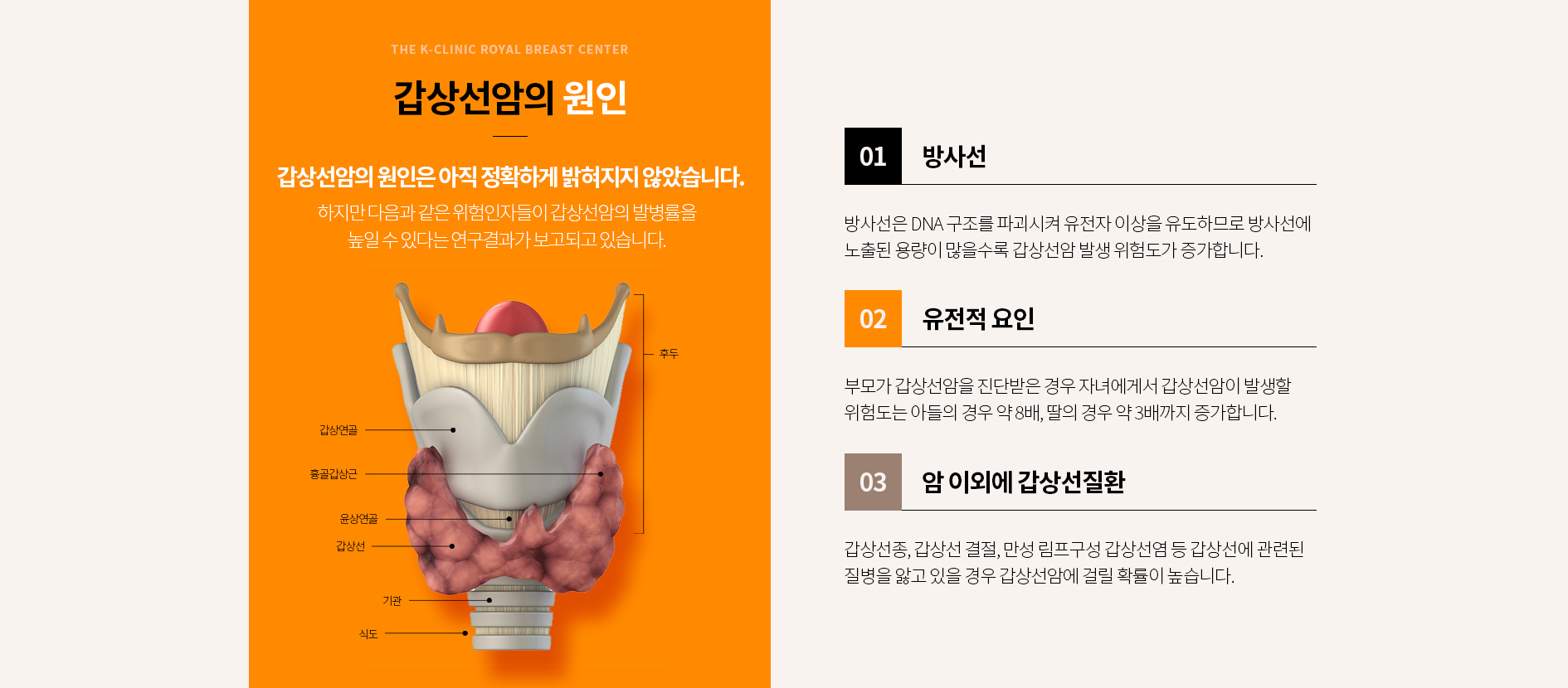갑상선암의 위험 요인에는 방사선 노출, 갑상선암의 가족력 및 특정 유전 질환이 포함됩니다. 갑상선암의 증상으로는 인후의 덩어리 또는 부종, 삼키기 어려움, 쉰 목소리, 인후통 또는 인후통 등이 있습니다. 갑상선암 치료에는 갑상선 제거 수술, 방사선 요법 및/또는 화학 요법이 포함될 수 있습니다.