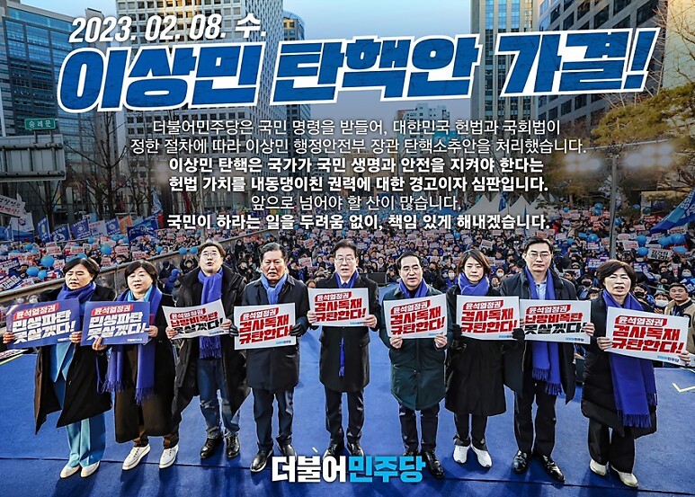 시민의 목숨을 지켜야 할 자리에는 없었던 오전 일찍 민평연 상임 운영회의와 원내대책회의에 이어 ‘김강희 특검·이상민 파면추진국회 전체 집중 농성’에 참가했습니다. . 이상민 행정안전성 장관 탄핵안의 가결 “이상민 장관에 대한 탄핵소추는 무책임한 국가권력에 대한 국민의 엄격한 경고입니다. 또 민주당이 이상민 행정안전부장관에 대한 탄핵소추안을 강행처리 하는 경우, 법조인 출신 실세로 차관을 교체해, 정면 대응하는 방안을 검토하고 있습니다.대통령실의 관계자는, 강안부는 재해 안전과 지방 균형의 발전을 비롯해, 정부의 인사와 조직을 담당하는 핵심부이며 이상민 장관의 원내대책회의와 ‘김강희 특검·이상민 파면추진국회 전체 집중 농성’에서는 어제 국회에 출석 20230208 김기현 페이스북 김기현 국민의 힘 당 대표 후보 국민당원과 함께 20230208 카드뉴스 다운로드 첨부파일 202302086 첨부파일 202302088 이상 민장관 탄핵민주당의 자살골이 되는 조금 이상민 씨는 5천권을 읽고 4천개의 다큐멘터리를 먹고 20여권을 책 을 출판한 전업작. 2023.2.8 이상민 행정안전부