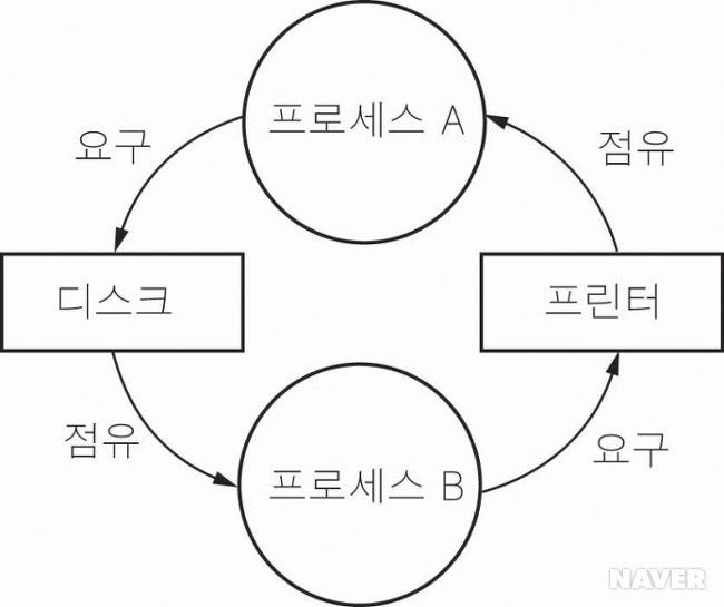 | 환형 대기 | 요구 사항과 할당된 리소스가 프로세스 사이에 원을 형성하는 경우 |